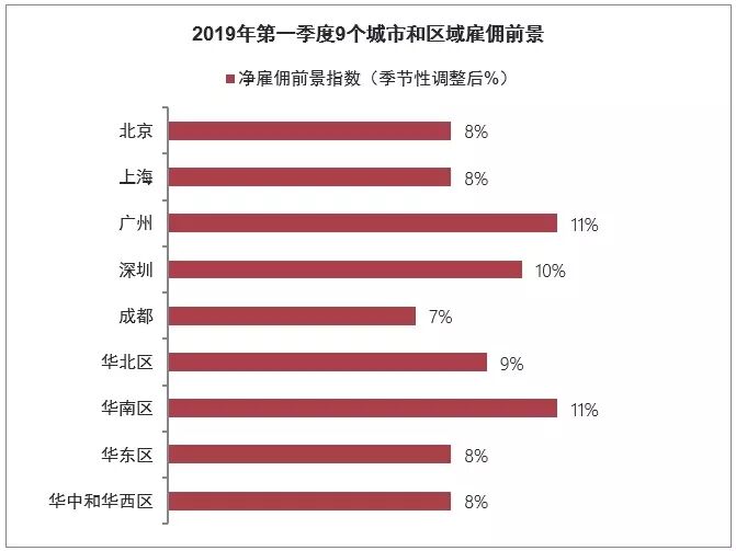 - 城市与区域间,华南区与广州的雇佣前景最强劲,净雇佣前景指数为+11%。